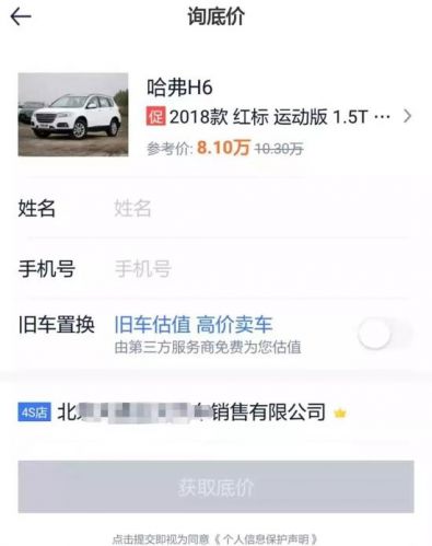 点击“获取底价”,会出现一个信息填写页面,需要填写姓名、手机号等信息。填完这些,才能继续点击“获取底价”。