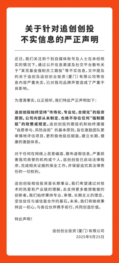 声明指出,追创创投始终坚持“市场化、专业化、合规化”的投资原则。追创创投的跟投机制始终遵循 “自愿参与、风险自担”的基本原则,旨在激励团队更审慎地评估项目、更积极地投后赋能,建立长期、健康的激励体系。追创创投相信投资是长期事业,同时希望通过对技术的热爱和产业链的理解,去支持更多敢想敢做的创新者。