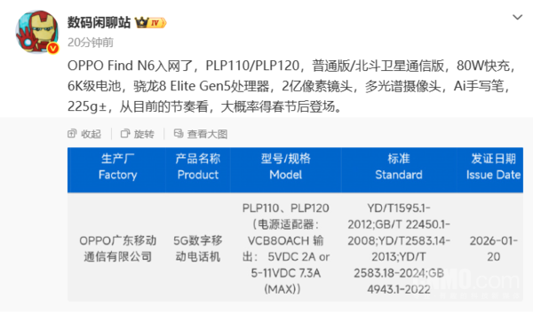疑似OPPO Find N6已入网:配骁龙8 Elite Gen5 支持80W快充快讯