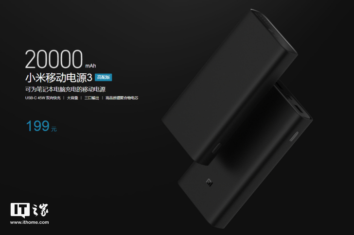 小米移动电源3 20000mAh高配版售价199元,小米移动电源3 的 USB-C 接口既可输入也可输出,小米正式上线了移动电源3 20000mAh高配版产品。