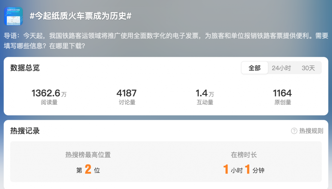 【TechWeb】11月1日消息,今日上午,“今起纸质火车票成为历史”登上微博热搜,最高位于热搜榜第二位,引发热议。截至发稿,相关话题微博阅读量超过1300万。