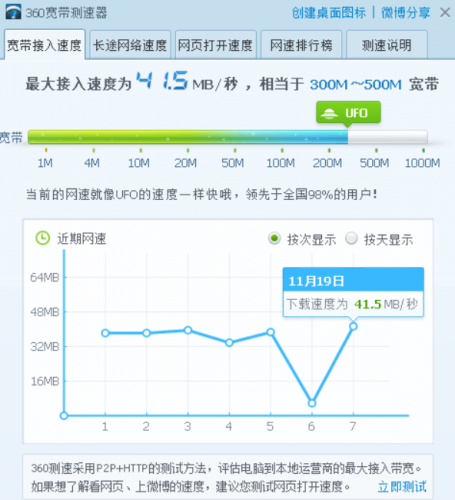 接着使用360安全助手,再测试一波网速。41.5M/s,软件给出了“相当于300M-500M宽带”的评价。