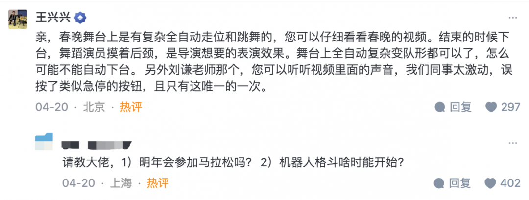 【TechWeb】4月22日消息,近日,有知乎用户质疑在春晚中亮相的宇树机器人出现故障。比如,H1上台时“是直接升上来的”,表演时“不能做大幅度移动”,下台时需要人类演员扶着,在和刘谦互动时也直接“死机瘫了”。