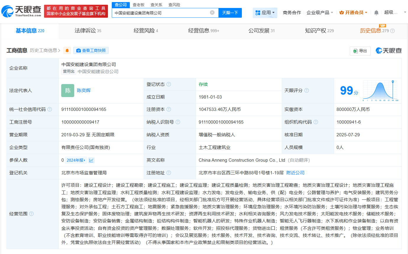 天眼查App显示,近日,中国安能建设集团有限公司发生工商变更,注册资本由50亿人民币增至约104.75亿人民币。