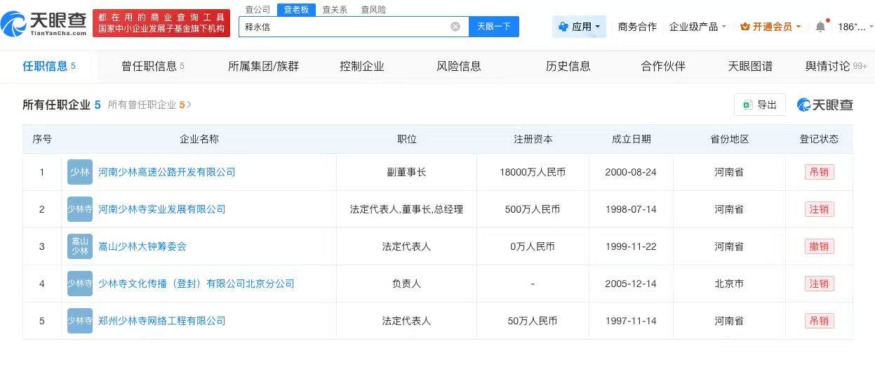 天眼查App显示,释永信名下关联企业中,5家已被注销、吊销或撤销,包括河南少林高速公路开发有限公司、河南少林寺实业发展有限公司、嵩山少林大钟筹委会等,释永信在上述企业担任法定代表人、董事长、总经理等职务。