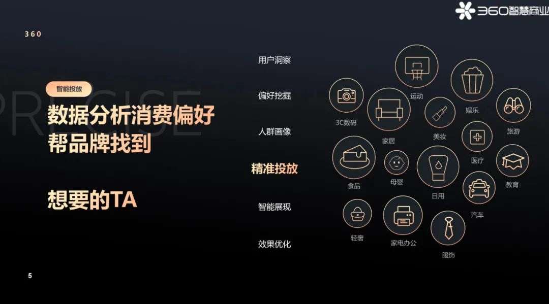 在底层,通过360营销大数据的支撑,深度洞察用户消费偏好;中间层则是精细化的分发,以AI分发为核心的触达体系,更精准,效率更高;上层则是智能展现以及最终的高效触达。