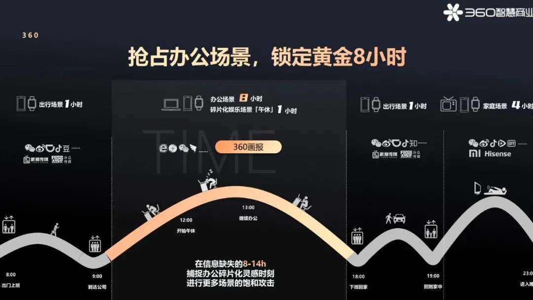 360很早就意识到了这一点。从360今年推出的画报产品的动作来看,背后隐藏的是3亿上班族的碎片化的注意力,是高价值人群的“黄金8小时”。