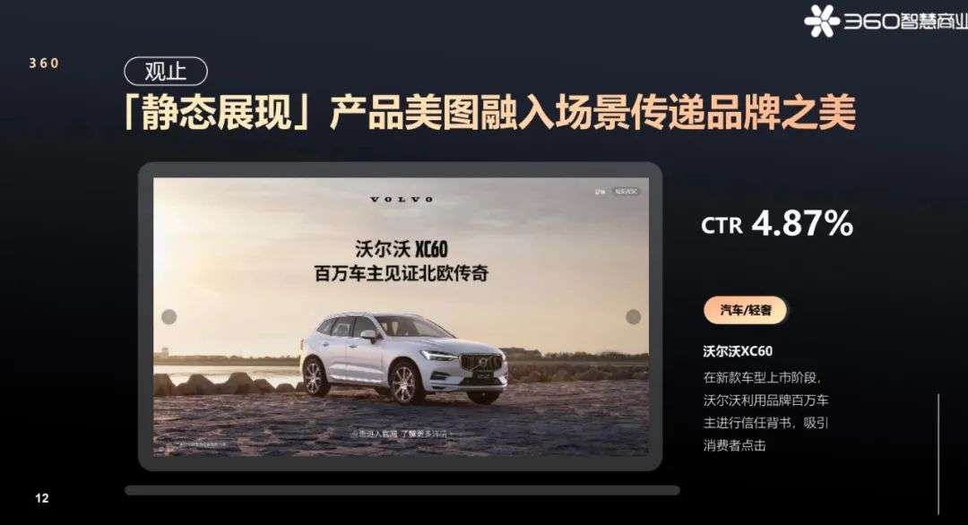 在沃尔沃XC60上市阶段,通过360画报的静态展现,产品美图与品牌希望传递的“百万车主”信任背书关键信息高度融合,CTR达到4.87%。对于职场高收入人群来说,对这样的品牌影响力传达,一方面不会感到打扰(画报本身也是极具美感的屏保壁纸),另一方面,也容易引起意向用户的兴趣,实现品牌关键信息的传达。