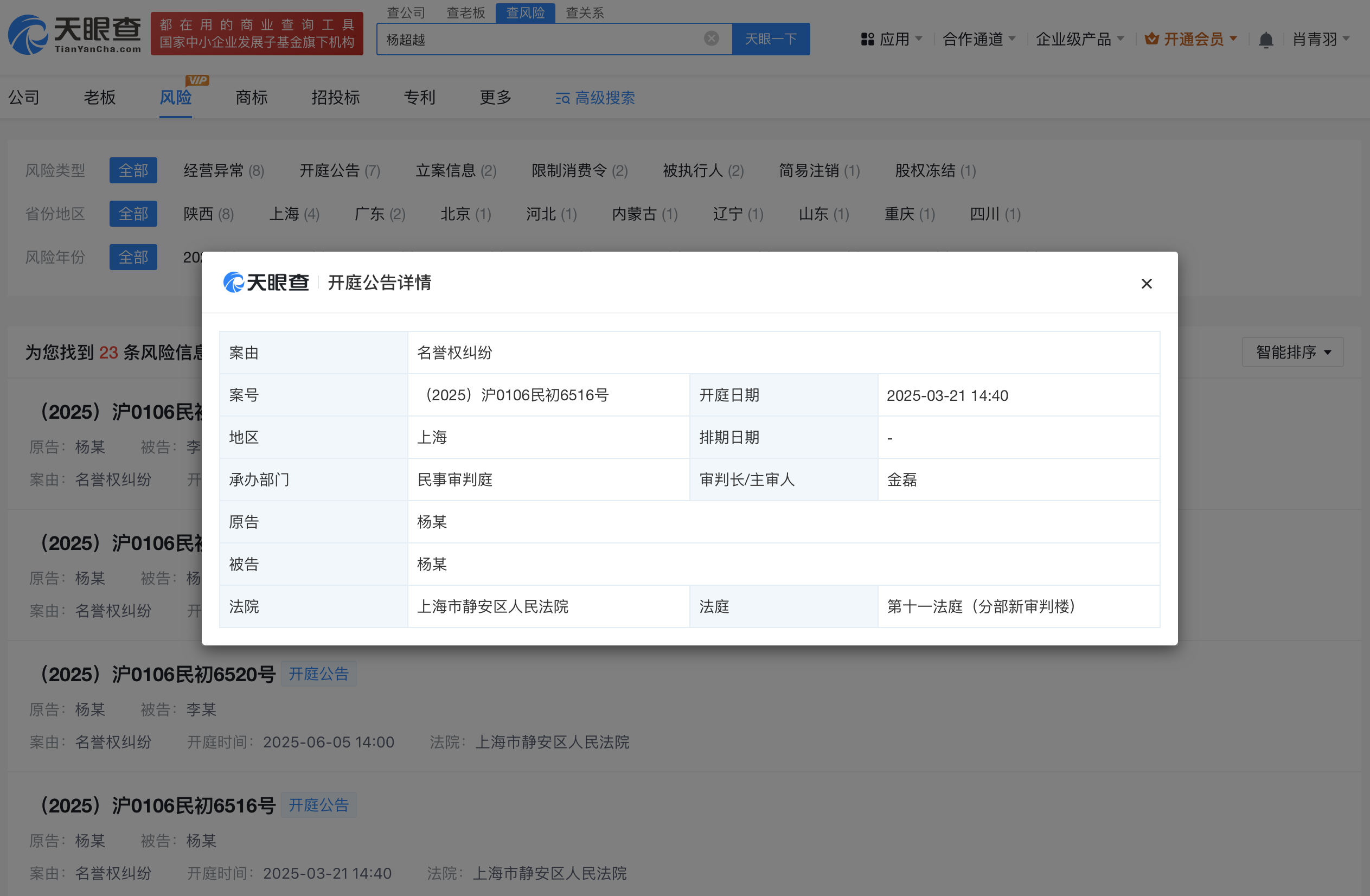 天眼查法律诉讼信息显示,近日,杨超越新增多个开庭公告,涉及与杨某某、李某等相关名誉权纠纷案件,原告为杨超越,案件分别将于3月21日、6月5日在上海市静安区人民法院开庭审理。