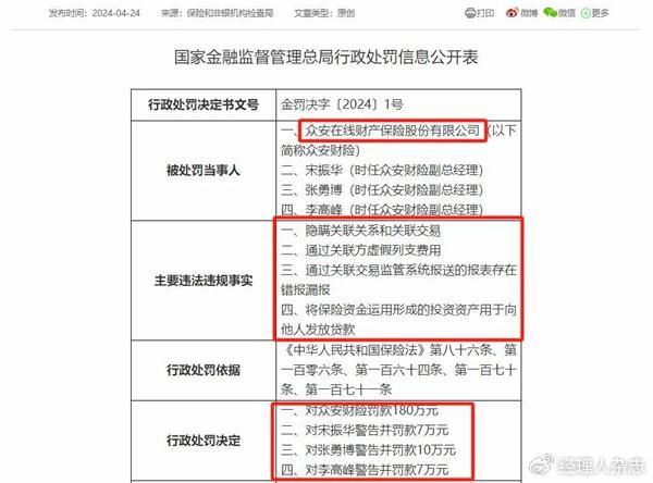 4月24日,国家金融监督管理总局给众安在线开出一张罚单。罚单显示,众安在线因涉及四项违规操作而受到处罚。其中包括隐瞒了关联关系及其相关交易的情况,利用关联方进行虚假费用申报,提交的财务报告中出现了错误或遗漏信息,以及将保险资金投资形成的资产违规用于向第三方提供贷款。针对这些违规行为,公司总计被罚款180万元人民币。此外,时任公司的三位副总经理——宋振华、张勇博及李高峰,也分别收到了警告处分,并被处以个人罚款。
