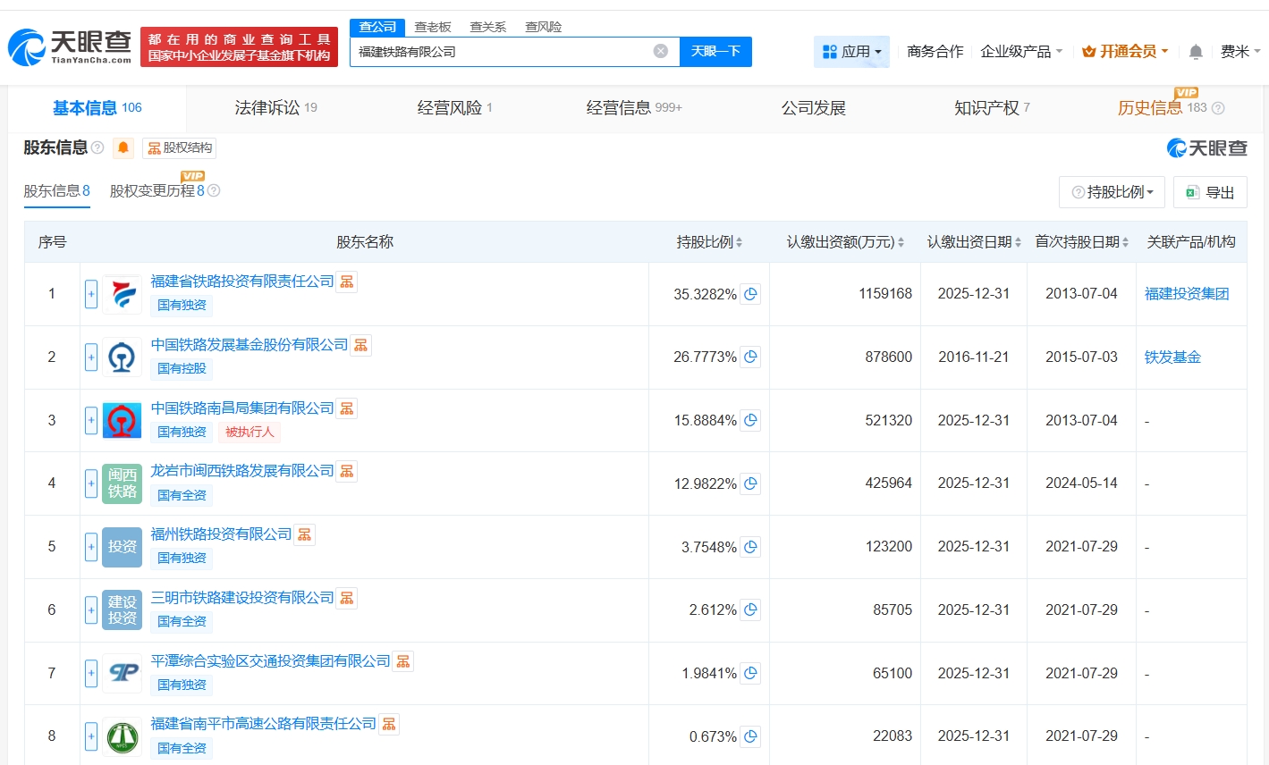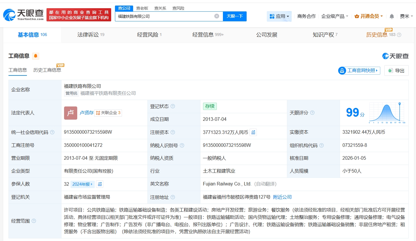 天眼查工商信息显示,近日,福建铁路有限公司发生工商变更,注册资本由约328.1亿人民币增至约377.1亿人民币,增幅约15%。