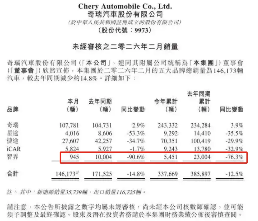 2月受春节假期、工作日偏少影响,国内车市整体承压,不少车企销量出现下滑。但背靠华为与奇瑞的智界品牌,交出的成绩单却格外刺眼:2 月销量仅 945 辆,同比暴跌 90.6%,跌幅远超行业平均水平,表现堪称低迷。