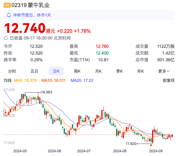 蒙牛乳业股价在2023年2月达到39.17港元/股的高点后,开始了较长时间的下跌,低点至11.82港元/股,较高点跌幅接近70%。截至9月10日收盘,公司股价为12.74港元/股,总市值501亿港元,与往昔早已不可同日而语。