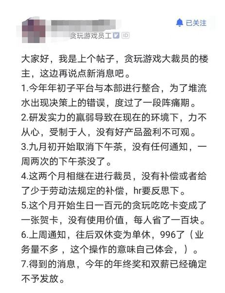 【TechWeb】据红星资本局报道,近日,在职场社交平台,有贪玩游戏(《原始传奇》《龙腾传世》 《贪玩蓝月》发行方)员工爆料称该公司在大规模裁员,“九月份开始取消了下午茶,没有任何通知,这两个月陆续在裁员,今年的年终奖和双薪已经确定不予发放。”并称未来一段时间还会发放降薪公告。