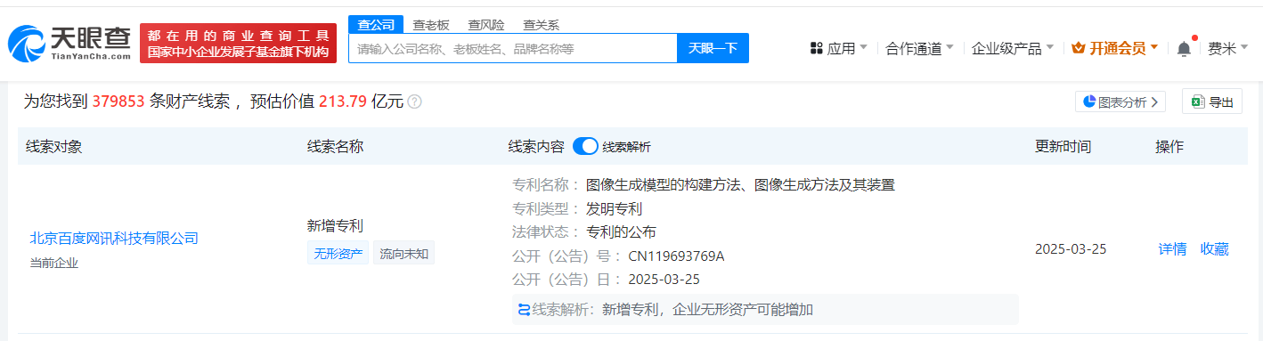 天眼查财产线索信息显示,近日,北京百度网讯科技有限公司申请的“图像生成模型的构建方法、图像生成方法及其装置”专利公布。