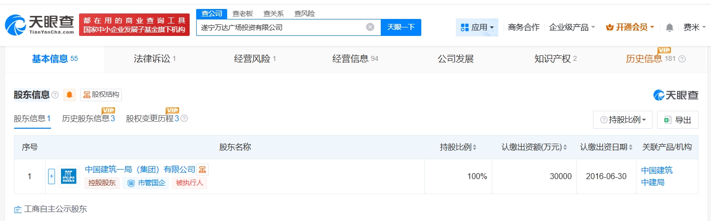 天眼查工商信息显示,近日,遂宁万达广场投资有限公司发生工商变更,原股东大连万达商业管理集团股份有限公司退出,新增中国建筑一局(集团)有限公司为全资股东,吴华卸任法定代表人,由吴国强接任,同时多位主要人员发生变更。