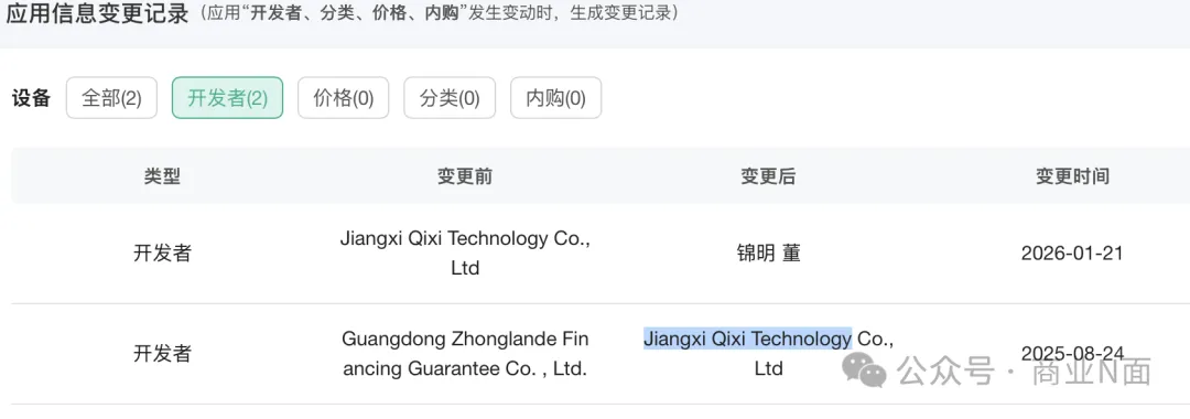 天眼查显示,江西迁享韵成立于2025年9月11日,自然人郭广华、杨海旺分别持股80%、20%。另据七麦数据,“买呗”曾用名“随时用”“随意用”,经历过两次开发者信息变更,前两者分别为“广东中兰德融资担保有限公司”、江西仟喜科技有限公司。