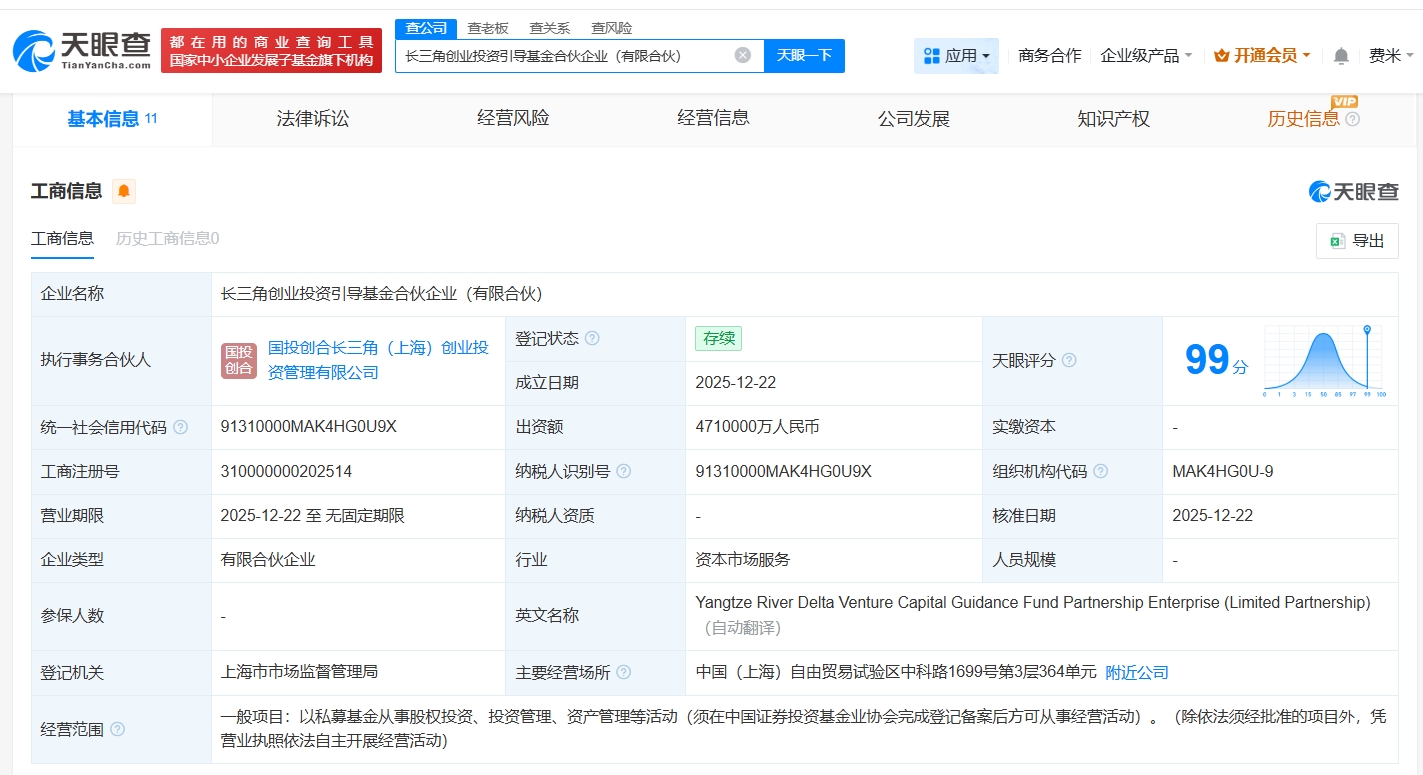 天眼查App显示,近日,长三角创业投资引导基金合伙企业(有限合伙)成立,执行事务合伙人为国投创合长三角(上海)创业投资管理有限公司,出资额471亿人民币,经营范围为以私募基金从事股权投资、投资管理、资产管理等活动,由安徽海螺集团有限责任公司、国家创业投资引导基金有限公司、国家开发投资集团有限公司等共同出资。