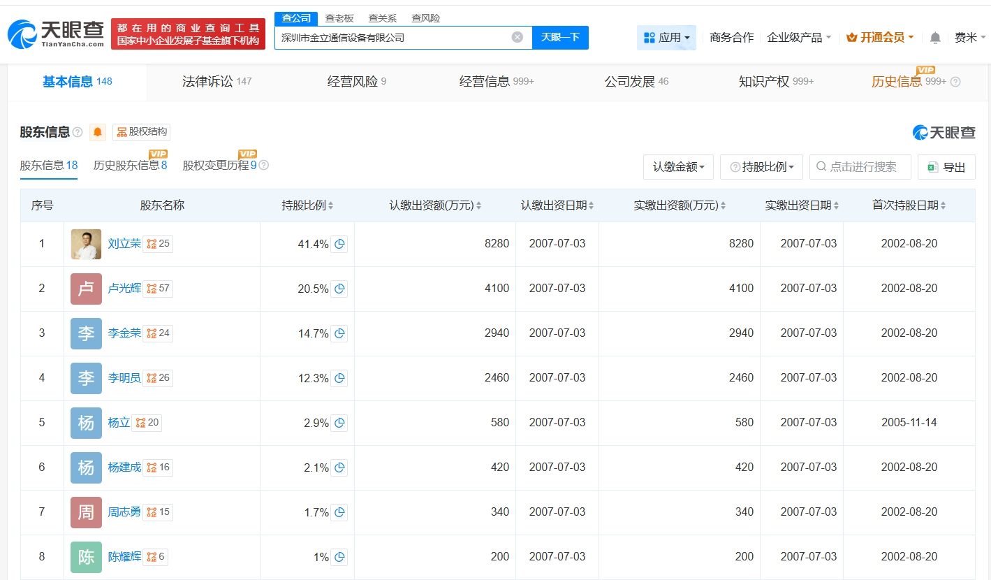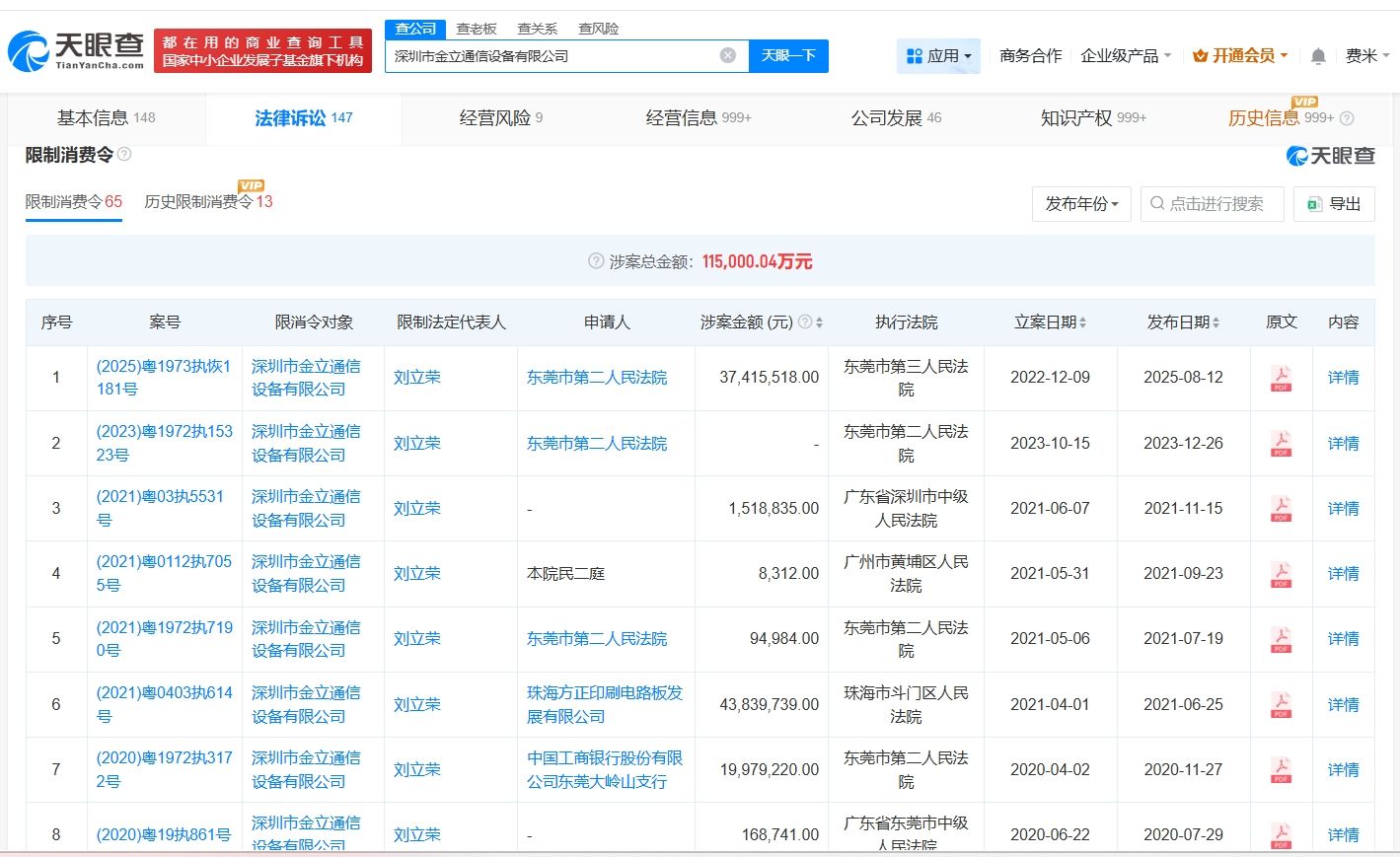 天眼查App显示,金立手机关联公司深圳市金立通信设备有限公司成立于2002年8月,法定代表人为刘立荣,注册资本2亿人民币,经营范围包括通信设备的技术开发及销售、经营进出口业务、信息服务业务等,由刘立荣、卢光辉、李金荣等共同持股。法律诉讼信息显示,该公司现存多条股权冻结、失信被执行人(老赖)、限制消费令及终本案件信息。参保人数信息显示,该公司参保人数从2016年的1632人降至2020年的0人。