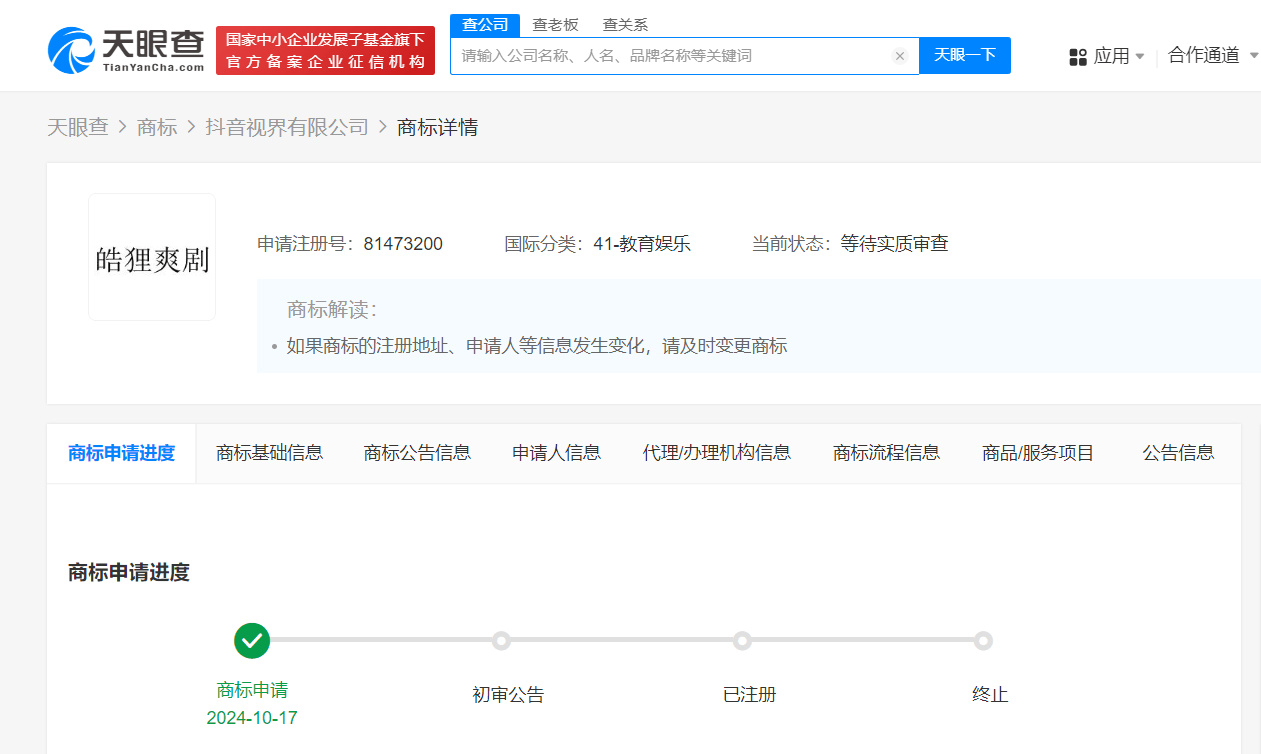 天眼查知识产权信息显示,近日,抖音视界有限公司申请注册多枚“芒杜剧屋”“皓狸爽剧”“泰玫剧屋”“夜润麦剧”等商标,国际分类涉及教育娱乐、通讯服务、网站服务等,当前商标状态均为等待实质审查。