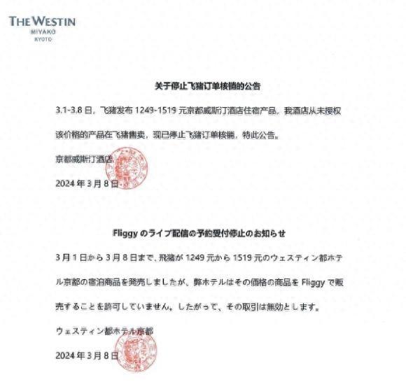 此后,有显示为京都威斯汀酒店发出的声明称:“3.1-3.8日,飞猪发布1249-1519元京都威斯汀酒店住宿产品,我酒店从未授权该价格的产品在飞猪售卖,现已停止飞猪订单核销,特此公告。”