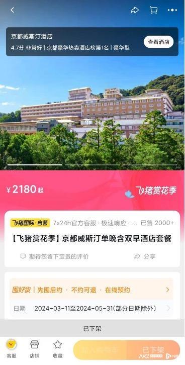3月8日,飞猪再度发文推出京都威斯汀“攻城价”称,鉴于此前推出的上述产品已经爆卖大几千份,3月底的樱花季、五一不加价的核销库存已经被抢约一空,由此决定再降150元,叠加100元券(限时限量),即消费者可以以1249元的价格购买到京都威斯汀酒店1晚含早套餐。并表示,清明五一以及樱花季不额外加价。