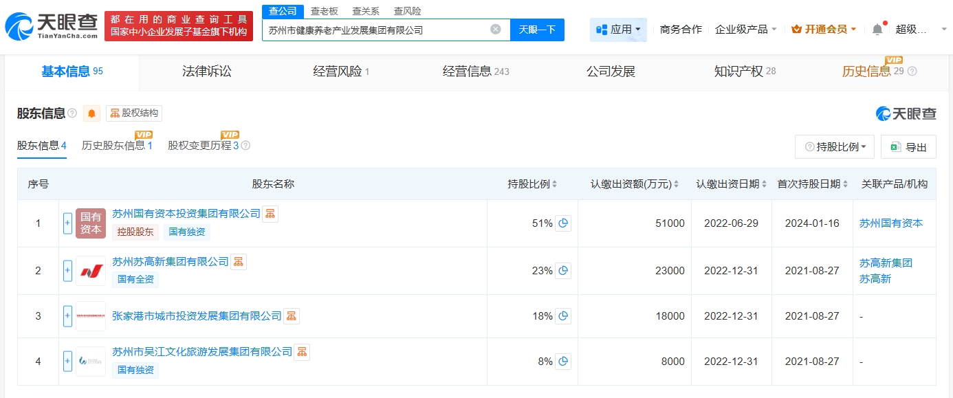 该公司成立于2021年8月,法定代表人为陈隆,经营范围包括养老服务、护理机构服务、养生保健服务等。股东信息显示,该公司由苏州国有资本投资集团有限公司、苏州苏高新集团有限公司、张家港市城市投资发展集团有限公司、苏州市吴江文化旅游发展集团有限公司共同持股。