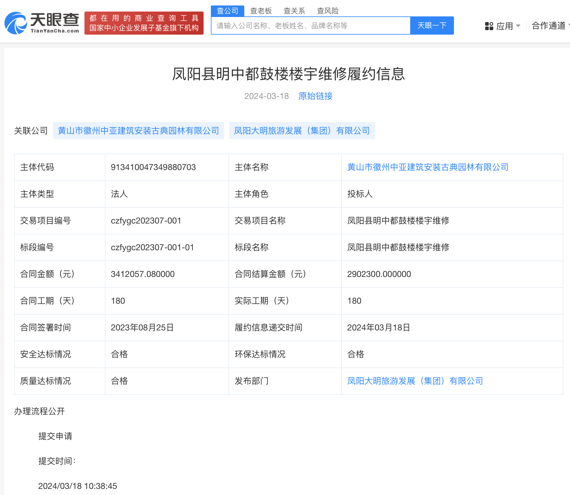 天眼查App显示,凤阳大明旅游发展(集团)有限公司曾发布该楼楼宇的维修招标公告,由黄山市徽州中亚建筑安装古典园林有限公司中标所得,合同签署日期为2023年8月25日,完成日期是2024年。维修合同显示,合同金额约341.2万元,合同结算金额约290.2万元。