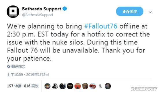 也许会有人猜测“9999小时”是某种《辐射76》的新年彩蛋,不过B社官推发布的通告却否定了这种可能性——推特文称B社将在今天通过热修修复核弹发射井bug,届时《辐射76》将暂时无法使用。