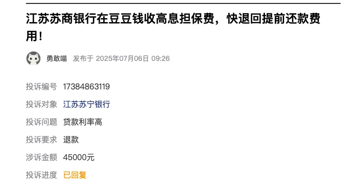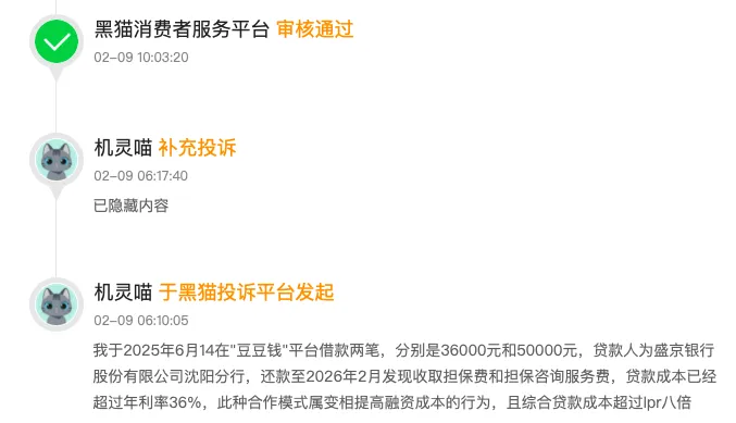 更惊人的案例来自大额借款的“隐形代价”。另一名借款人于2025年6月在豆豆钱平台借款两笔,金额分别为36000元和50000元,资金方为盛京银行沈阳分行。还款至2026年2月,借款人发现平台收取了担保费和担保咨询服务费,贷款成本已超过年利率36%,且综合贷款成本超过LPR的8倍。投诉人愤慨地表示,此种合作模式属“变相提高融资成本的行为”。