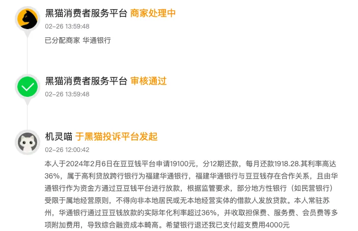 第一,涉嫌违反属地经营原则。福建华通银行作为一家民营银行,受限于属地经营原则,原则上不得向非本地居民或无本地经营实体的借款人发放贷款。但有投诉人明确指出,本人常驻苏州,华通银行却通过豆豆钱平台向其放款,并收取超过36%的实际年化利率。投诉人反问:“作为民营商业银行,你们具备跨区域放款资格吗?”