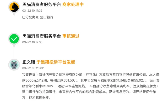 真实案例揭示了数字背后的残酷现实。一位借款人投诉称,在豆豆钱平台借款3600元分12期,每期还款361.56元,其中每月包含强制收取的担保服务费55.02元,经计算综合年化利率高达35.93%,远超24%的监管红线。值得注意的是,该笔贷款的资金方为营口银行,但投诉人直言“营口银行作为持牌银行,未审核合作平台的综合融资成本,默许高息行为”。