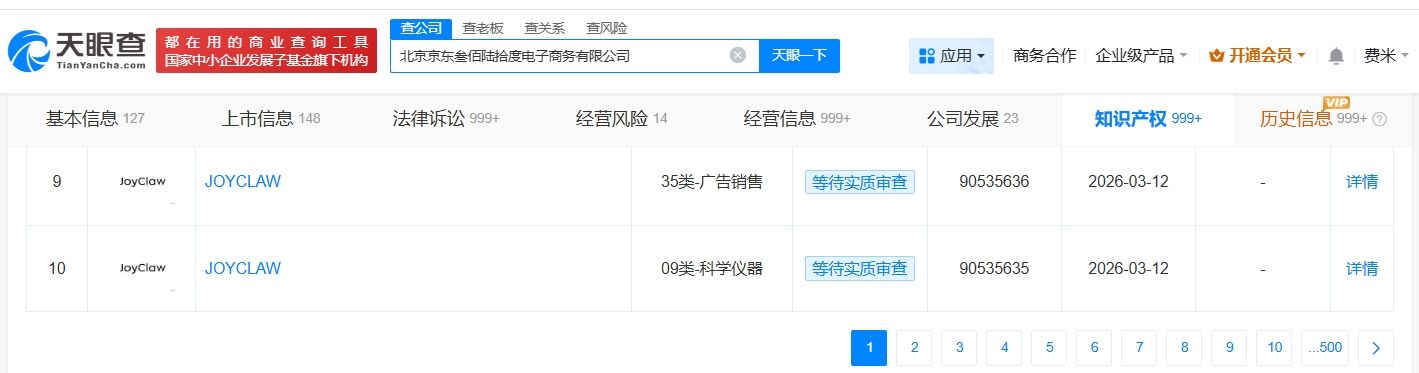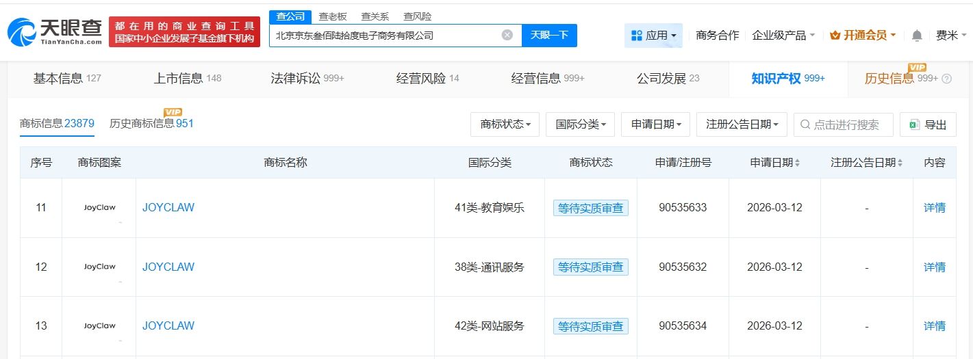 天眼查知识产权信息显示,近日,北京京东叁佰陆拾度电子商务有限公司申请注册多枚“JOYCLAW”商标,国际分类包括教育娱乐、通讯服务、网站服务等,当前商标状态均为等待实质审查。