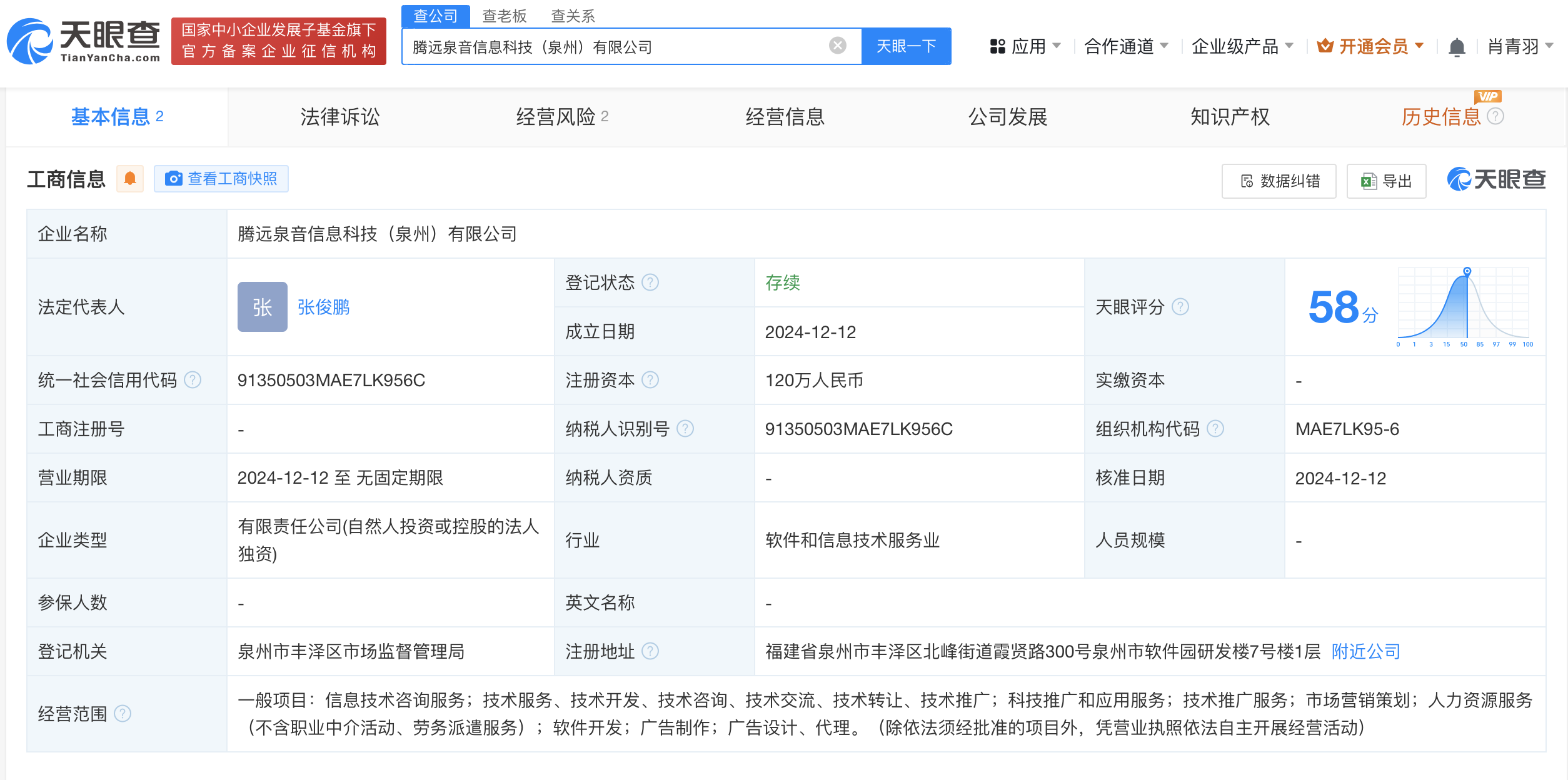 天眼查App显示,近日,腾远泉音信息科技(泉州)有限公司成立,法定代表人为张俊鹏,注册资本120万人民币,经营范围含信息技术咨询服务、科技推广和应用服务、技术推广服务、市场营销策划、人力资源服务、软件开发等。股权全景穿透图显示,该公司由腾讯音乐娱乐科技(深圳)有限公司全资持股,后者为腾讯音乐娱乐香港有限公司全资子公司。