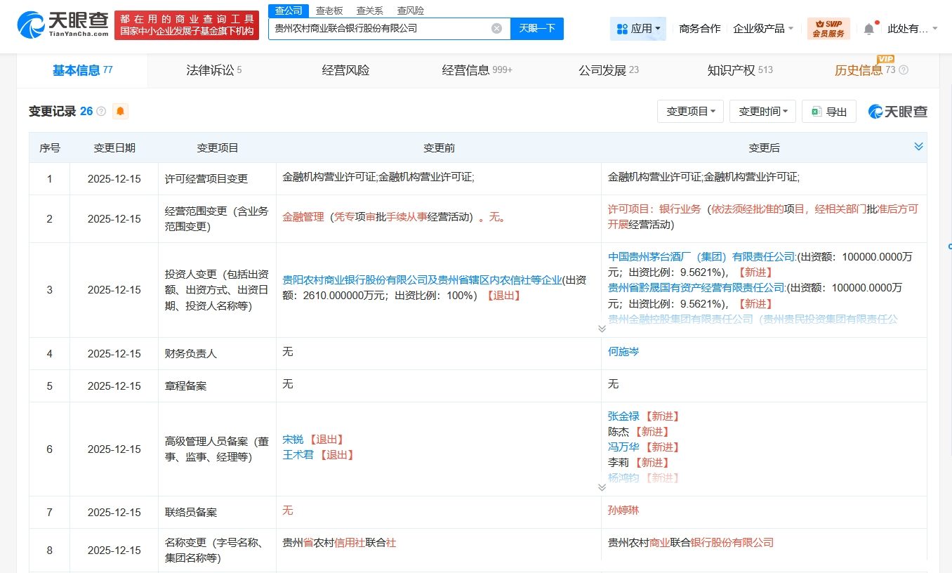 天眼查工商信息显示,近日,贵州省农村信用社联合社发生工商变更,企业名称变更为贵州农村商业联合银行股份有限公司,新增贵州金融控股集团有限责任公司(贵州贵民投资集团有限责任公司)、贵州省财政厅、贵州省黔晟国有资产经营有限责任公司、中国贵州茅台酒厂(集团)有限责任公司为股东,同时,注册资本由2610万人民币增至约104.6亿人民币。