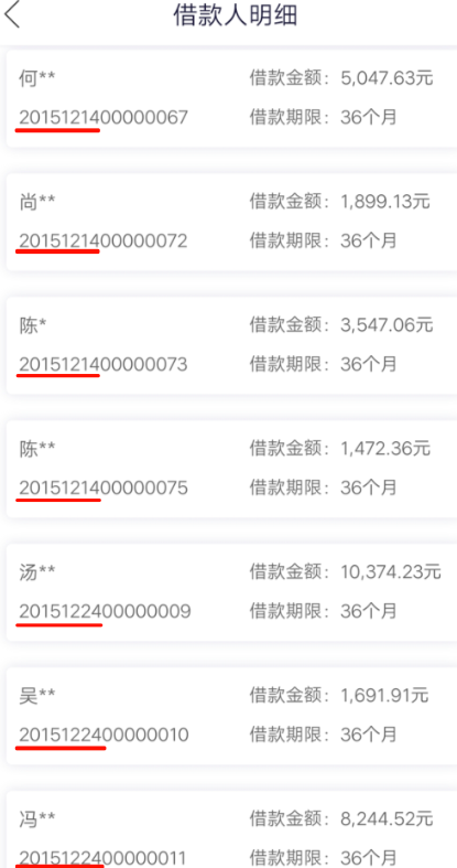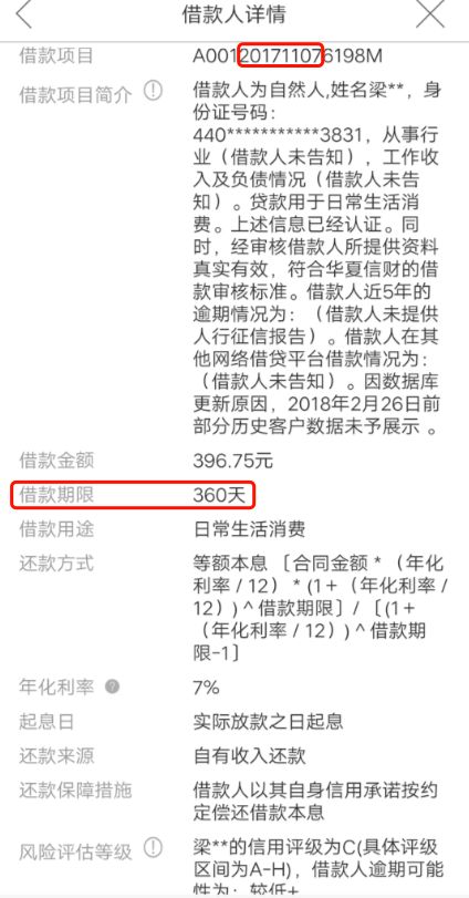 比如花虾金融App的在售项目虾宝90天1588期,其中一个底层债权对应梁姓借款人的借款时间为2017年11月7日,借款期限为360天。
