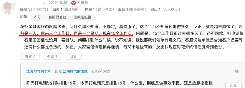 今天(10月28日),我们咨询华夏信财旗下的花虾金融客服当前退出进度,客服表示截至10月25日正处理9月16日到期的项目,据此推算,退出时间已长达40天。