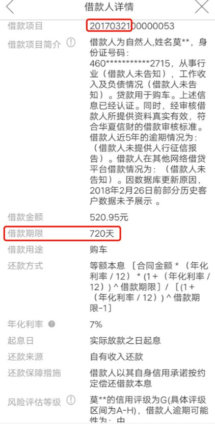 再比如另一个在售项目融宝365天750期,其中一个底层债权对应莫姓借款人的借款时间为2017年3月21日,借款期限为720天。