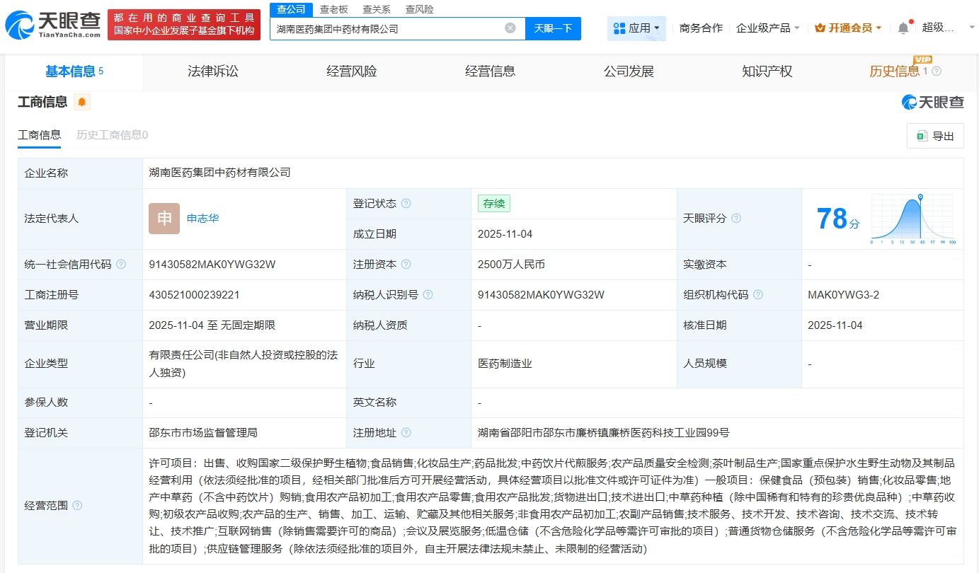 天眼查App显示,近日,湖南医药集团中药材有限公司成立,法定代表人为申志华,注册资本2500万人民币,经营范围包括药品批发、中药饮片代煎服务、农产品质量安全检测等。股东信息显示,该公司由湖南医药集团有限公司全资持股。