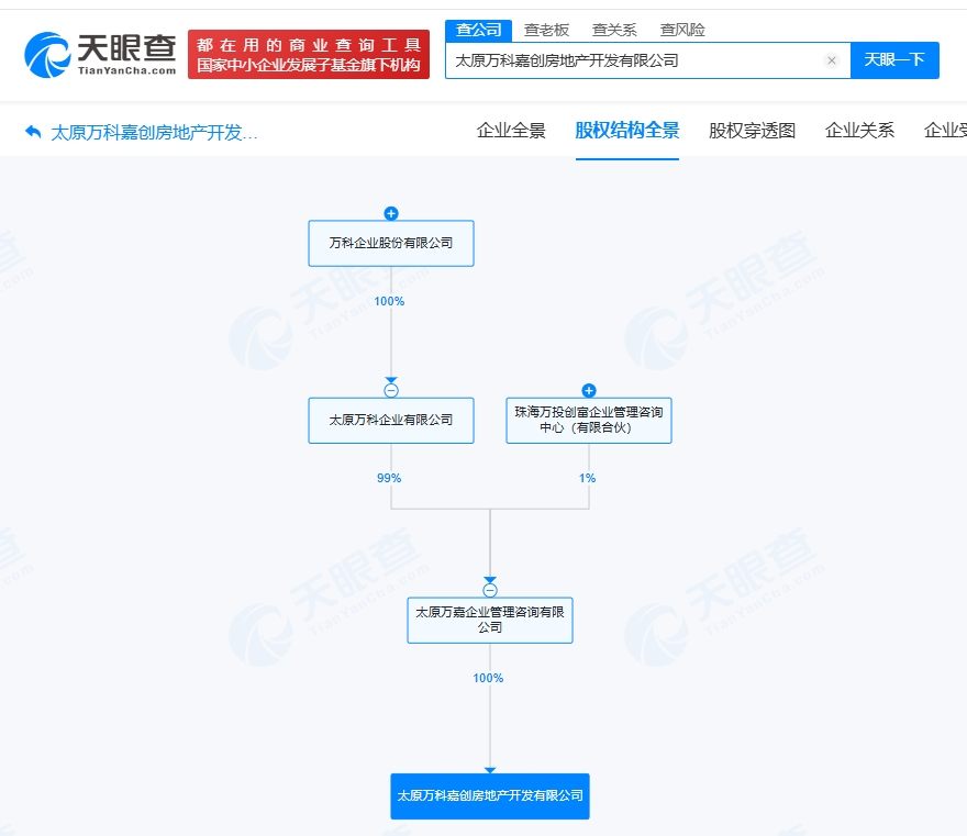 太原万科嘉创房地产开发有限公司成立于2018年7月,法定代表人为杨洪涛,经营范围为房地产开发经营、房屋租赁。股权全景穿透图显示,该公司由万科A(000002)旗下太原万嘉企业管理咨询有限公司全资持股。