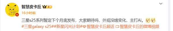 据知名数码博主@智慧皮卡丘 最新发布的信息显示,与此前曝光的消息基本一致,全新的三星Galaxy S25系列暂定下个月也就是明年1月底发布,外观变化不大,仍将主打AI技术。结合此前相关爆料,该系列将继续包含Galaxy S25、Galaxy S25+和Galaxy S25 Ultra三款机型,其中前两款将提供蓝色、紫色、黑色和绿色,而超大杯的三星Galaxy S25 Ultra则将采用钛金属机身设计。