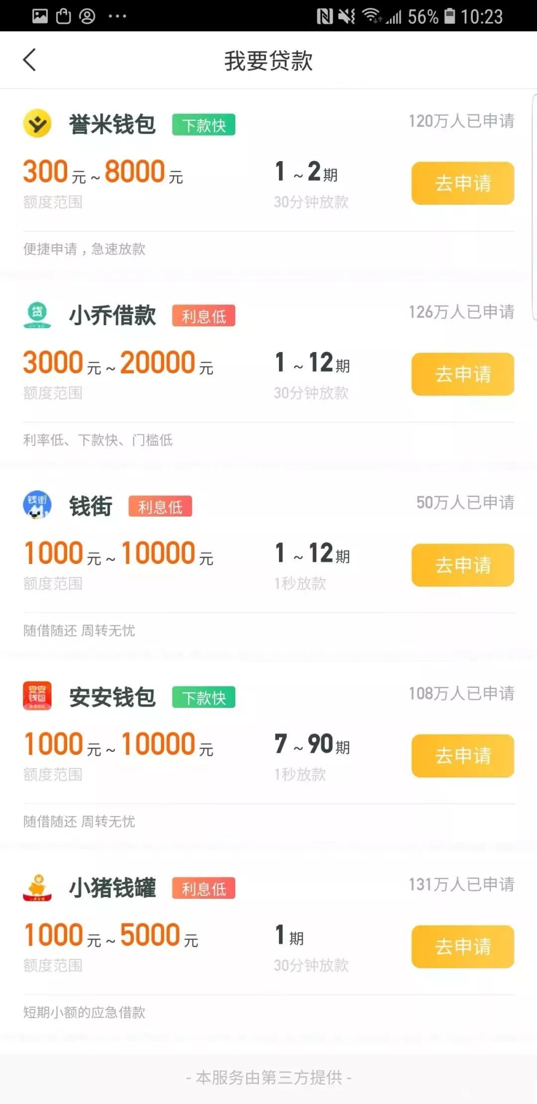 该贷款超市中现金贷产品额度普遍在2000-8000元左右,借款期限为1-2个月左右。每款产品旁边都会显示已有上百万人申请。