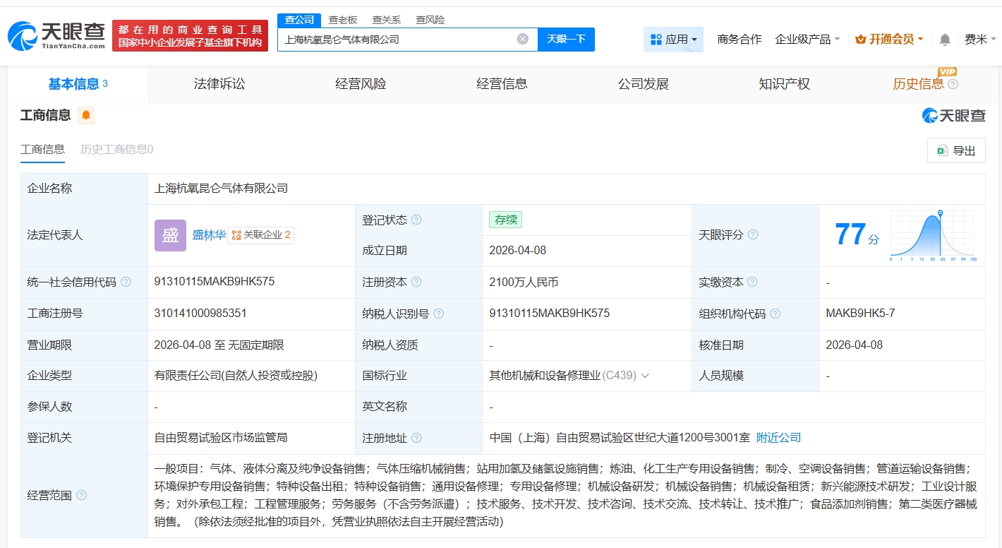 天眼查工商信息显示,近日,上海杭氧昆仑气体有限公司成立,法定代表人为盛林华,注册资本2100万人民币,经营范围包括气体、液体分离及纯净设备销售,气体压缩机械销售,站用加氢及储氢设施销售等。