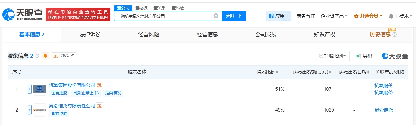 天眼查工商信息显示,近日,上海杭氧昆仑气体有限公司成立,法定代表人为盛林华,注册资本2100万人民币,经营范围包括气体、液体分离及纯净设备销售,气体压缩机械销售,站用加氢及储氢设施销售等。股东信息显示,该公司由杭氧股份(002430)、昆仑信托有限责任公司共同持股。