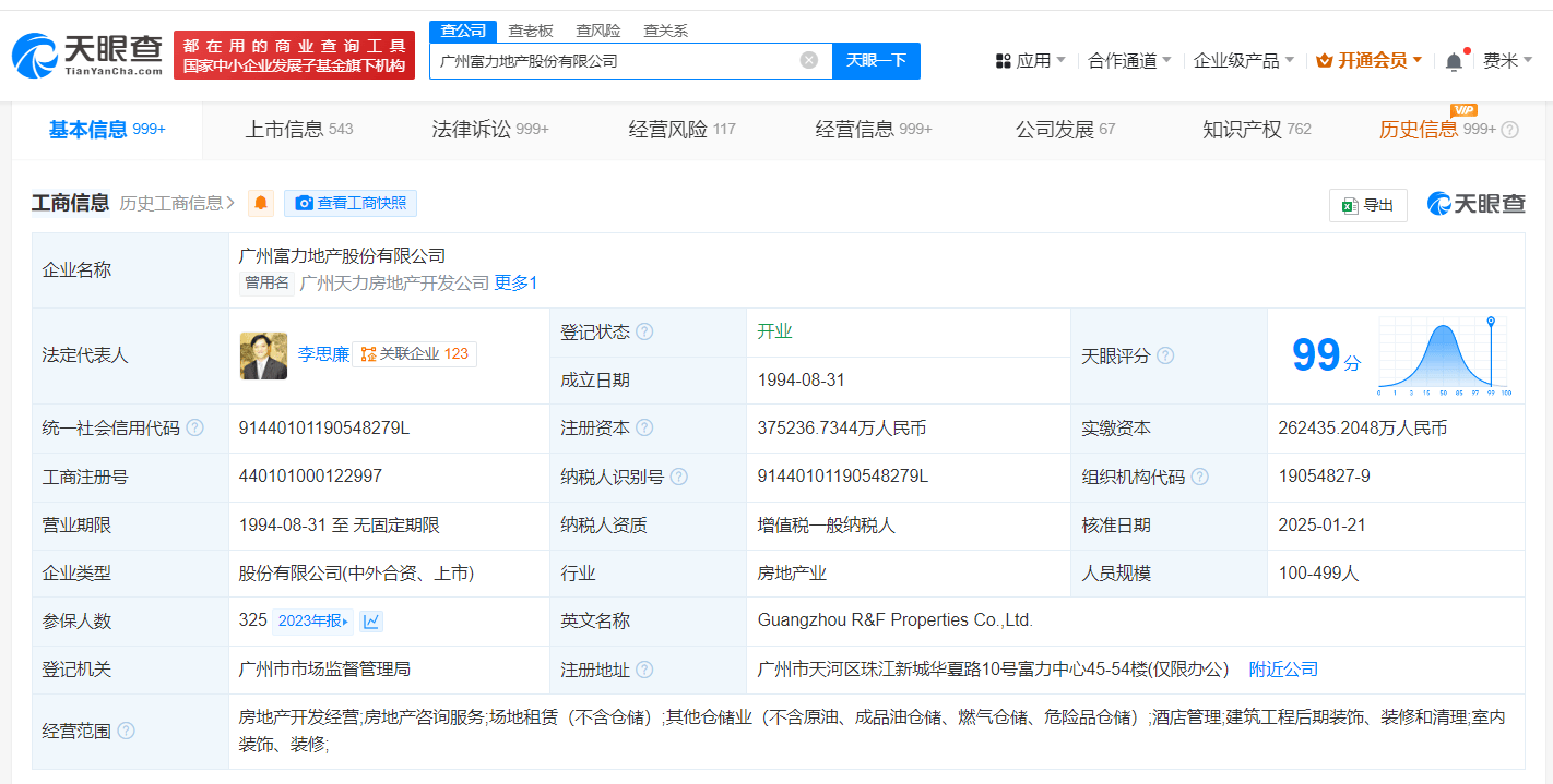 广州富力地产股份有限公司成立于1994年8月,法定代表人为李思廉,注册资本约37.5亿人民币,经营范围包括房地产开发经营、房地产咨询服务、场地租赁等,由李思廉、张力、陈量暖等共同持股。