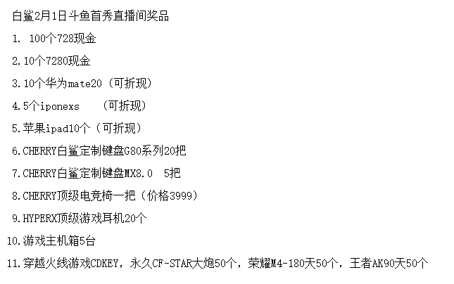 据爆料,2月1日当晚白鲨将在直播间中抽出价值高达万的奖品,可以说是相当壕了,大主播的气场势必会吸引不少的观众前来,或许会创造当日斗鱼最高人气的直播间呢。