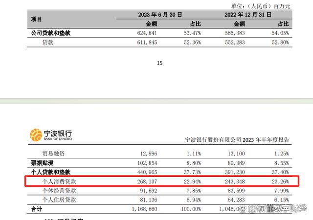就宁波银行而言,今年上半年,宁波银行的个人消费贷款达2681.37亿元,较年初增长10.19%,增幅不小但低于整体,更低于个贷,增速有待进一步提高。