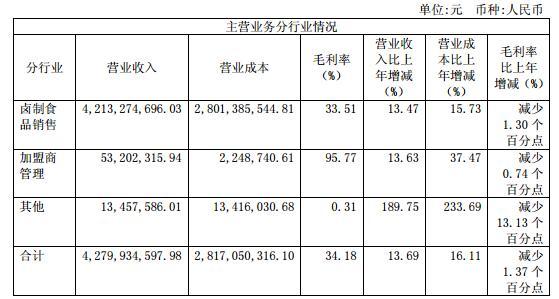 看起来,实现营收利润双增长的绝味底气十足,但不容乐观的是,绝味的产品毛利率正处在全面下降的状态。据其年报显示,绝味的主营业务毛利率同比减少了1.37%,其原因主要是原材料价格上涨,导致营业成本增长4个多亿,同比增幅16.08%。