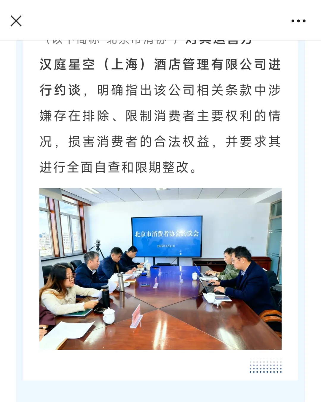 据“北京市场监管”微信公众号消息,2月11日,北京市消费者协会(以下简称“北京市消协”)依法约谈华住会运营方汉庭星空(上海)酒店管理有限公司,直指该公司相关条款中涉嫌存在排除、限制消费者主要权利的情况,损害消费者的合法权益,并要求其进行全面自查和限期整改。