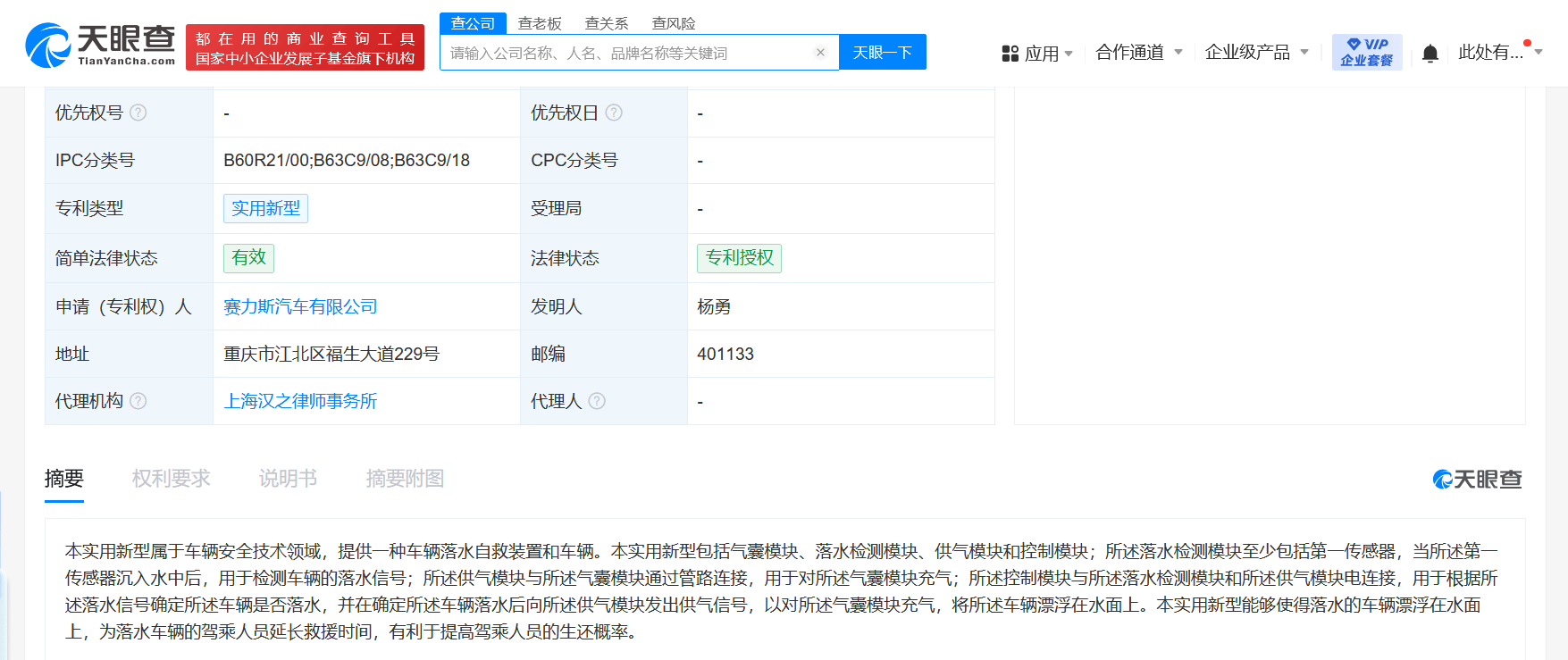赛力斯落水自救专利可使车辆漂浮在水面 赛力斯车辆落水自救专利获授权观点
